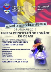 Primăria Municipiului Turda invită locuitorii oraşului să participe la manifestările prilejuite de aniversarea a 158 de ani de la Unirea Principatelor Române, care se vor desfășura marți, 24 ianuarie 2017.