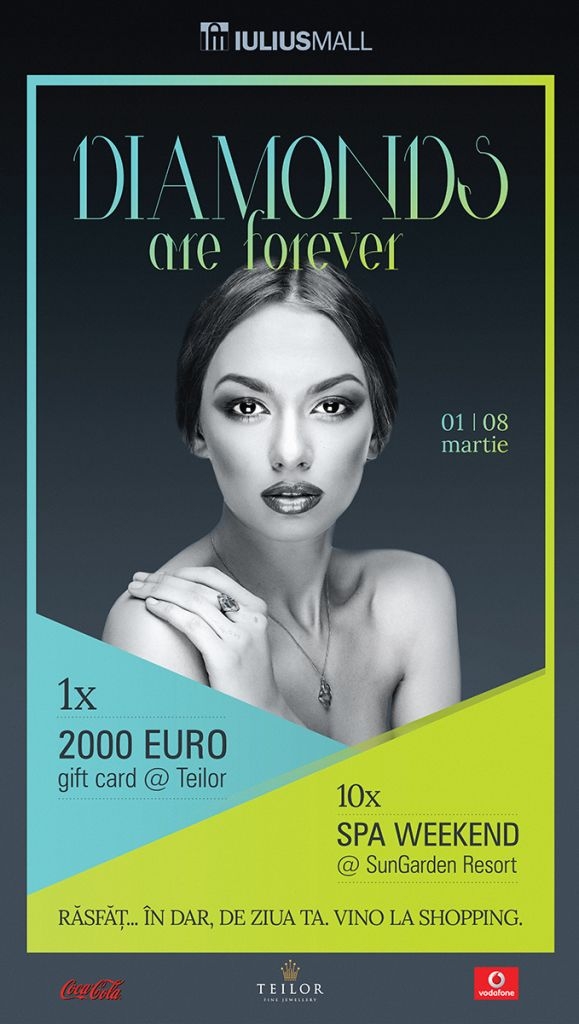 Anul acesta, de ziua ta, Iulius Mall Cluj îți spune un secret: „Diamonds are forever”. Așa că, sesiunile tale de shopping vor fi unele de răsfăț. Și nu oricum, ci cu cele mai frumoase premii, pe care orice femeie și le dorește: bijuterii cu diamante și weekend-uri de relaxare la SPA.