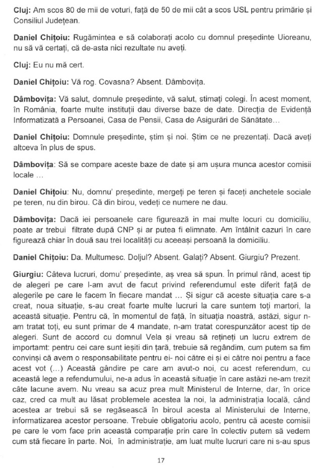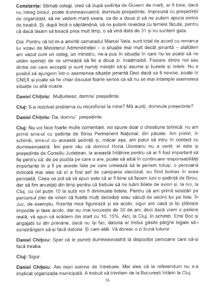 În aceeaşi şedinţă însă, liderului organizaţiei judeţene i se reproşează faptul că, în campania de la referendum liberalii clujeni nu au colaborat. Mai mult, din dialogul celor doi aflăm că, în campania pentru scrutinul din 29 iulie, conducerea PNL a trimis „întăriri“ la Cluj.